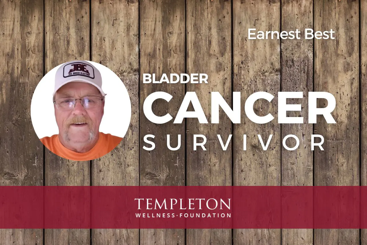 Featured image for the Earnest Best cancer survivor story. The design shows his portrait beside the title “Bladder Cancer Survivor,” set on a rustic wooden background with the Templeton Wellness Foundation banner. Used for the article and interview page.